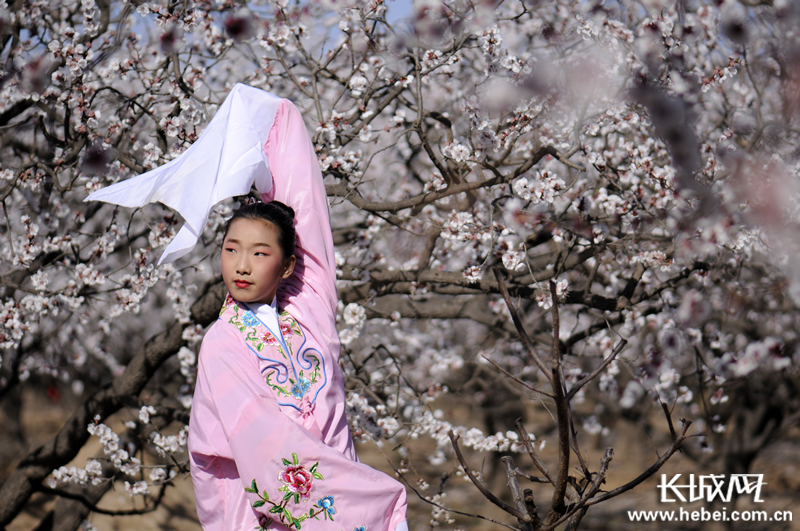 3月23日,演员在巨鹿县元泽路杏花园内表演节目。