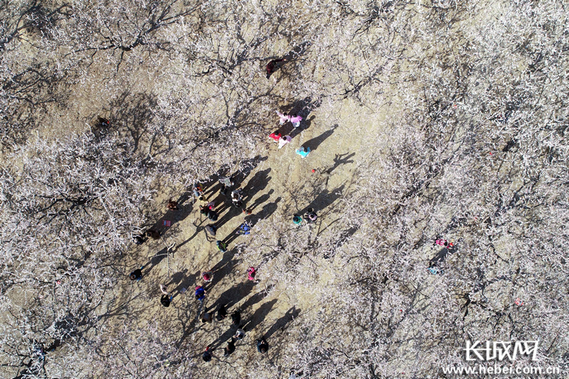 3月23日,游客在巨鹿县元泽路杏花园内观看演员表演(无人机拍摄)