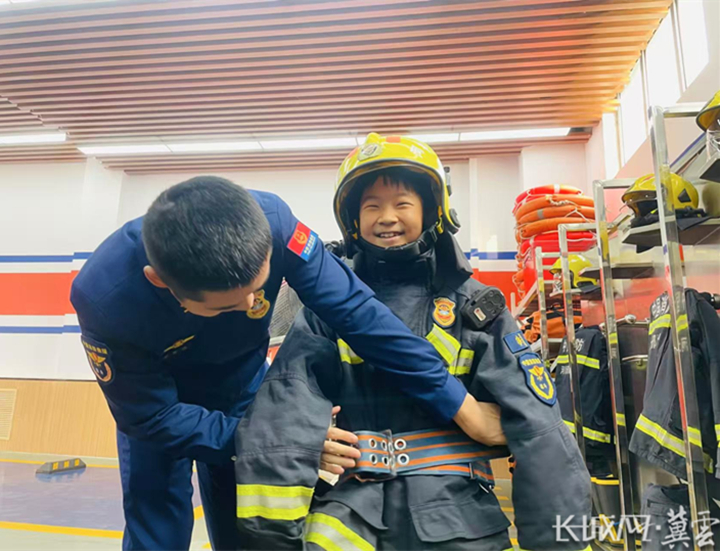 学生在消防员的帮助下试穿抢险救援服。通讯员 王丽华 供图