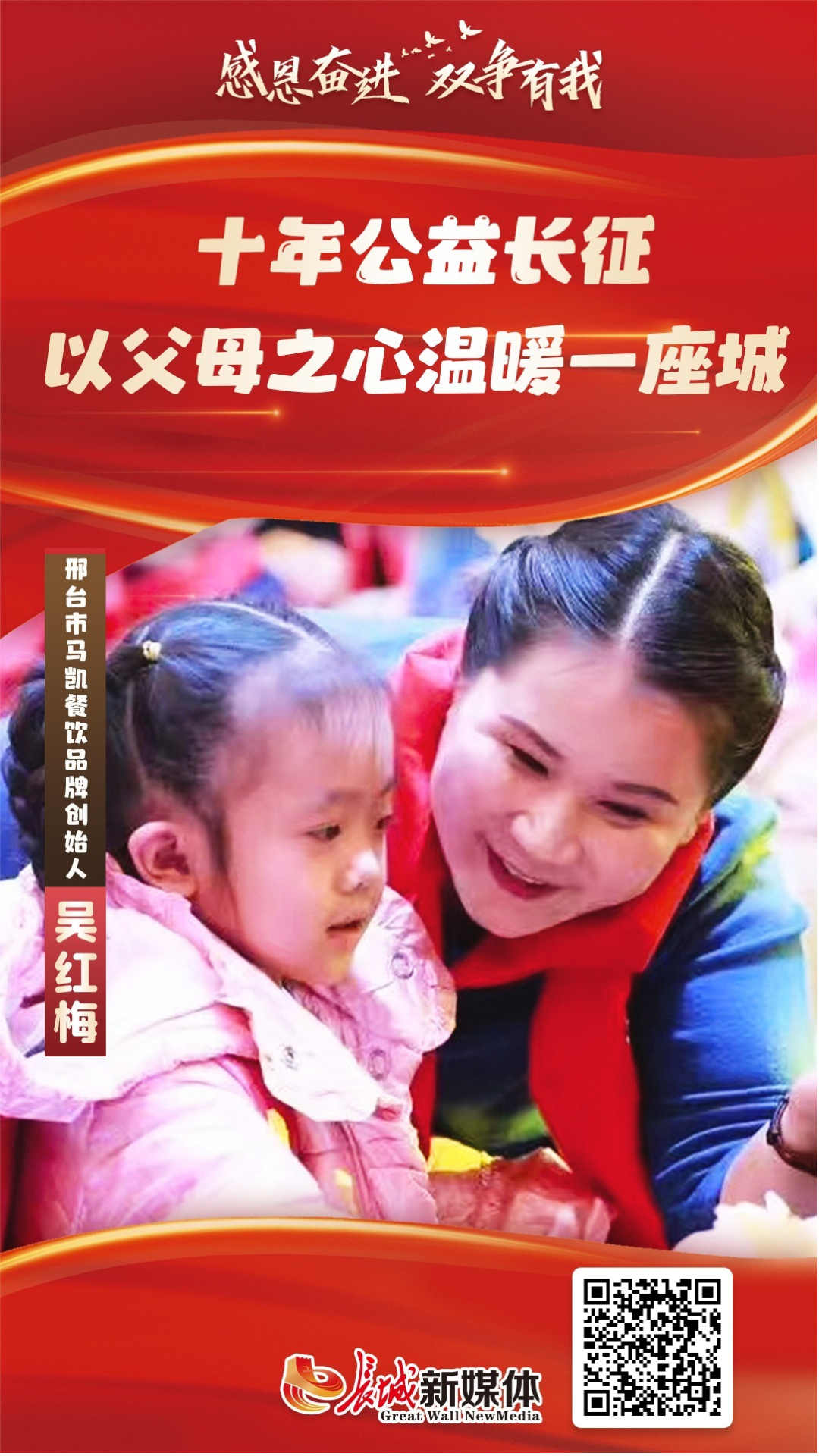 在邢襄大地,有这样一位餐饮企业家:她将企业家的社会责任化为十年如一日的默默耕耘,将“幼吾幼以及人之幼”的古训化作一场没有终点的温暖陪伴。她,就是“玉兰妈妈”志愿服务队发起人、河北省三八红旗手吴红梅。十年来,她以父母之心,带领团队踏上一条播撒希望、点亮未来的公益路,生动诠释了“感恩奋进 双争有我”的时代内涵与人性温度。
