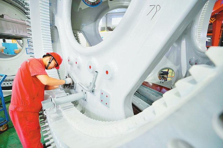 近年来,市开发区利用辖区内产业集聚的优势条件,通过龙头企业带动、出台政策补贴科技创新、拓展产业链等措施,引导发展现代产业体系,推动经济体系优化升级。图为工人在金风科技有限公司车间工作。(李院红 摄)