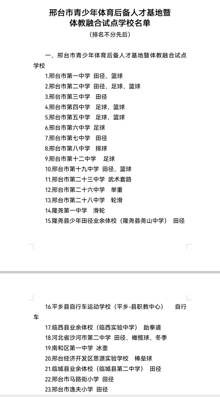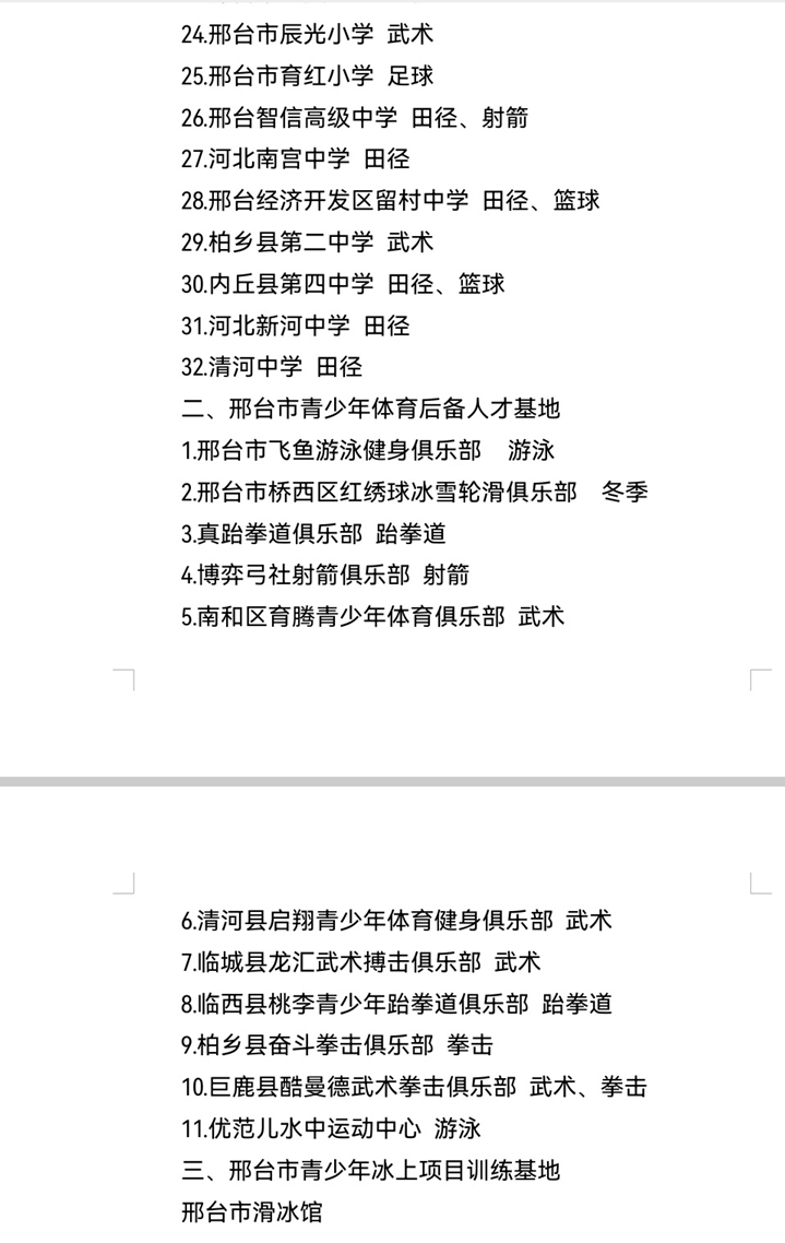 邢台市青少年体育后备人才基地暨体教融合试点学校(共32所)