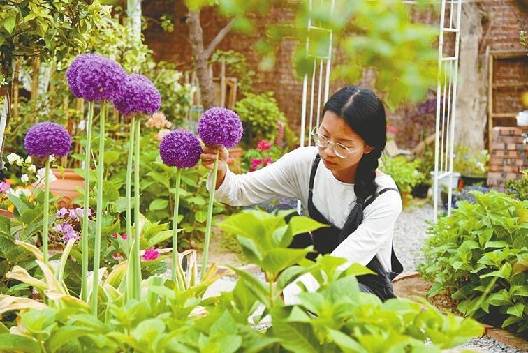巨鹿县居民伍俊在她亲手打造的省百优美丽庭院“豆豆花园”中修整绿植。
